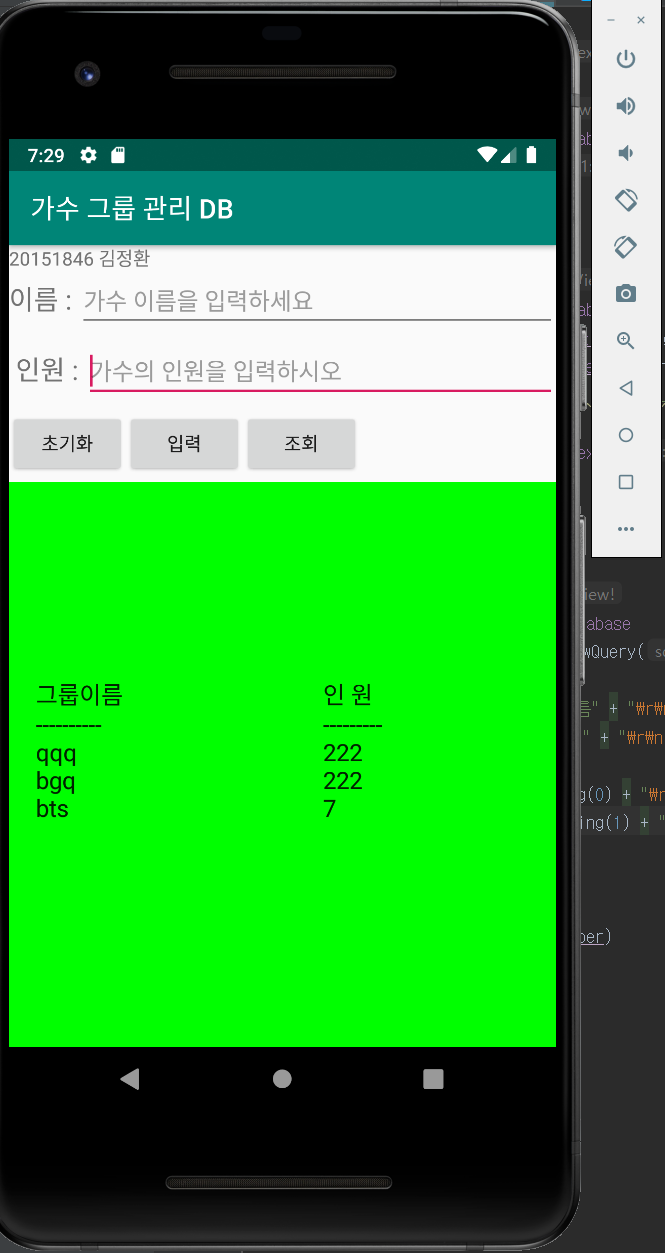 <?xml version="1.0" encoding="utf-8"?> <LinearLayout xmlns:android="http://schemas.android.com/apk/res/android" xmlns:app="http://schemas.android.com/apk/res-auto" xmlns:tools="http://schemas.android.com/tools" android:layout_width="match_parent" android:layout_height="match_parent" android:orientation="vertical" tools:context=".MainActivity"> <LinearLayout android:layout_width="fill_parent" android:layout_height="0dip" android:layout_weight="1" android:orientation="horizontal"> <TextView android:layout_width="wrap_content" android:layout_height="wrap_content" android:text="이름 : " android:textSize="20dp" /> <EditText android:id="@+id/edtName" android:layout_width="wrap_content" android:layout_height="wrap_content" android:hint="가수 이름을 입력하세요" android:layout_weight="1" /> </LinearLayout> <LinearLayout android:layout_width="fill_parent" android:layout_height="0dip" android:layout_weight="1" android:orientation="horizontal"> <TextView android:layout_width="wrap_content" android:layout_height="wrap_content" android:text=" 인원 : " android:textSize="20dp" /> <EditText android:id="@+id/edtNumber" android:hint="가수의 인원을 입력하시오" android:layout_width="wrap_content" android:layout_height="wrap_content" android:layout_weight="1" /> </LinearLayout> <LinearLayout android:layout_width="fill_parent" android:layout_height="0dip" android:layout_weight="1" android:orientation="horizontal"> <Button android:id="@+id/btnInit" android:layout_width="wrap_content" android:layout_height="wrap_content" android:text="초기화" /> <Button android:id="@+id/btnInsert" android:layout_width="wrap_content" android:layout_height="wrap_content" android:text="입력" /> <Button android:id="@+id/btnSelect" android:layout_width="wrap_content" android:layout_height="wrap_content" android:text="조회" /> </LinearLayout> <LinearLayout android:layout_width="fill_parent" android:layout_height="0dip" android:layout_weight="8" android:orientation="horizontal" > <EditText android:id="@+id/edtNameResult" android:layout_width="wrap_content" android:layout_height="match_parent" android:layout_weight="1" android:background="#00FF00" android:padding="20dp" /> <EditText android:id="@+id/edtNumberResult" android:layout_width="wrap_content" android:layout_height="match_parent" android:layout_weight="1" android:background="#00FF00" android:padding="20dp" /> </LinearLayout> </LinearLayout>MainActivity.kt