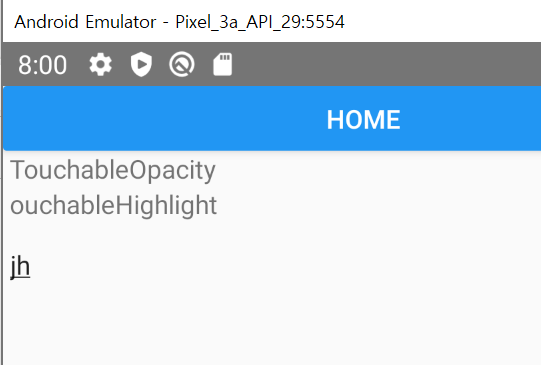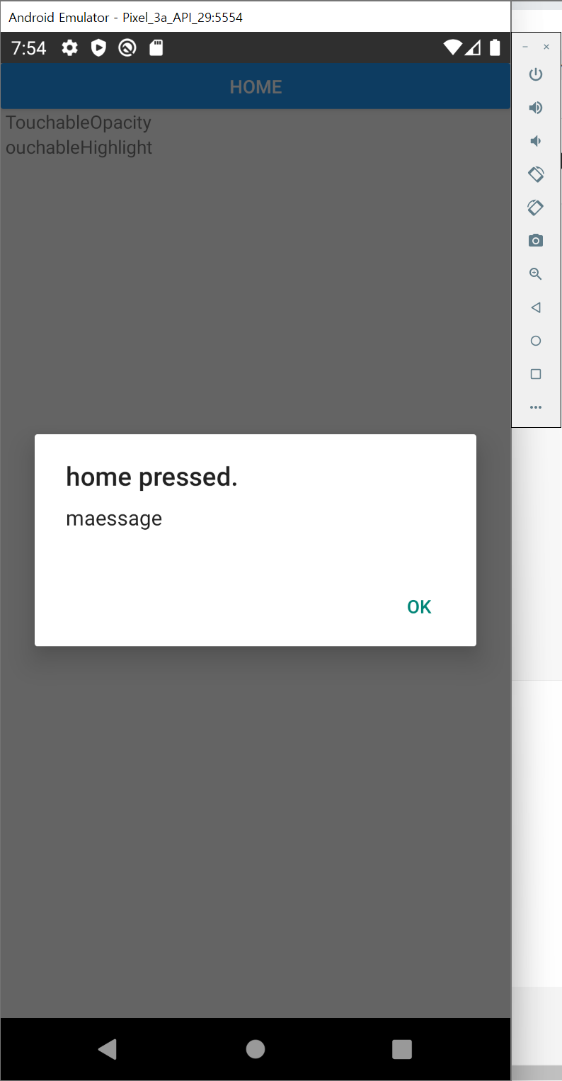 import React from 'react' import { Alert, SafeAreaView, Button } from 'react-native' import { TouchableOpacity, TouchableHighlight, Text } from 'react-native' const onPress = () => Alert.alert('home pressed.', 'maessage') export default function App() { return( <SafeAreaView> <Button title='Home' onPress={onPress} /> <TouchableOpacity onPress={onPress}> <Text> TouchableOpacity </Text> </TouchableOpacity> <TouchableHighlight onPress={onPress}> <Text> ouchableHighlight </Text> </TouchableHighlight> </SafeAreaView> ) }실행결과