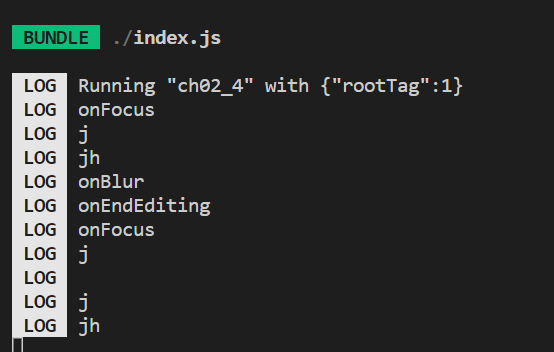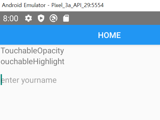 import React from 'react' import { Alert, SafeAreaView, Button } from 'react-native' import { TouchableOpacity, TouchableHighlight, Text } from 'react-native' import {TextInput} from 'react-native' const onPress = () => Alert.alert('home pressed.', 'maessage') export default function App() { return( <SafeAreaView> <Button title='Home' onPress={onPress} /> <TouchableOpacity onPress={onPress}> <Text> TouchableOpacity </Text> </TouchableOpacity> <TouchableHighlight onPress={onPress}> <Text> ouchableHighlight </Text> </TouchableHighlight> <TextInput placeholder="enter yourname" onChangeText={(text: string) => console.log(text)} onFocus={() => console.log('onFocus')} onBlur={() => console.log('onBlur')} onEndEditing={() => console.log('onEndEditing')} /> </SafeAreaView> ) }실행결과