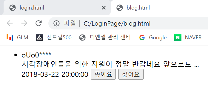 ul> <li> <div>oUo0****</div> <div>시각장애인들을 위한 지원이 정말 반갑네요 앞으로도 ...</div> <span>2018-03-22 20:00:00</span> <button> 좋아요 </button> <button> 싫어요 </button> </li> </ul>