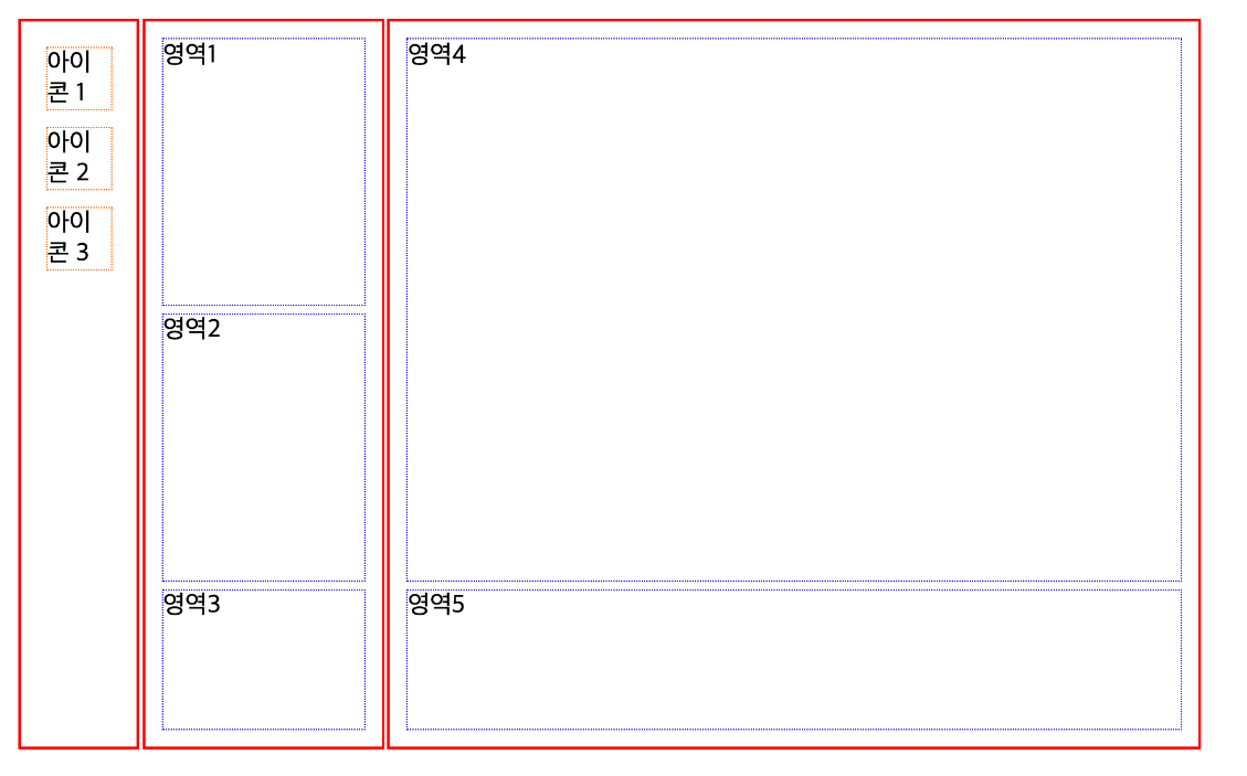 <div id="container"> <div class="col w10"> <div class="icon">아이콘 1</div> <div class="icon">아이콘 2</div> <div class="icon">아이콘 3</div> </div> <div class="col w20"> <div class="row h40">영역1</div> <div class="row h40">영역2</div> <div class="row h20">영역3</div> </div> <div class="col w70"> <div class="row h80">영역4</div> <div class="row h20">영역5</div> </div> </div>레이아웃 리셋(은근 많이 사용) -초기화