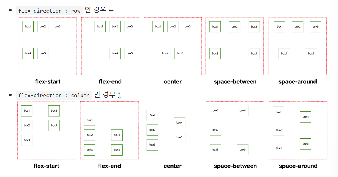 주요 속성 값 : flex-start, flex-end, center, space-between, space-around