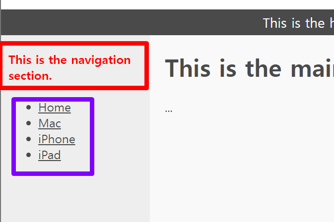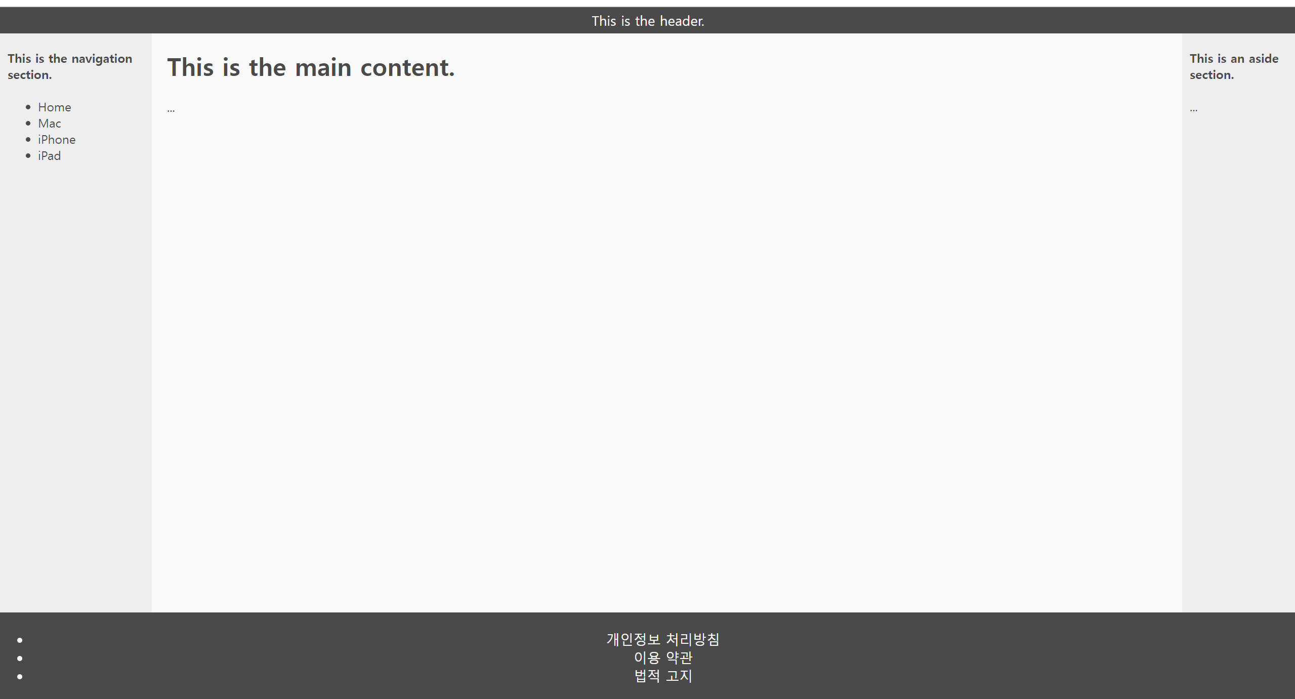 <!DOCTYPE html> <html lang="en"> <head> <meta charset="UTF-8"> <title>Modern CSS</title> <link rel="stylesheet" href="index.css" /> </head> <body> <header>This is the header.</header> <div class="container"> <nav> <h4>This is the navigation section.</h4> <ul> <li>Home</li> <li>Mac</li> <li>iPhone</li> <li>iPad</li> </ul> </nav> <main> <h1>This is the main content.</h1> <p>...</p> </main> <aside> <h4>This is an aside section.</h4> <p>...</p> </aside> </div> <footer> <ul> <li>개인정보 처리방침</li> <li>이용 약관</li> <li>법적 고지</li> </ul> </footer> </body> </html>index.css