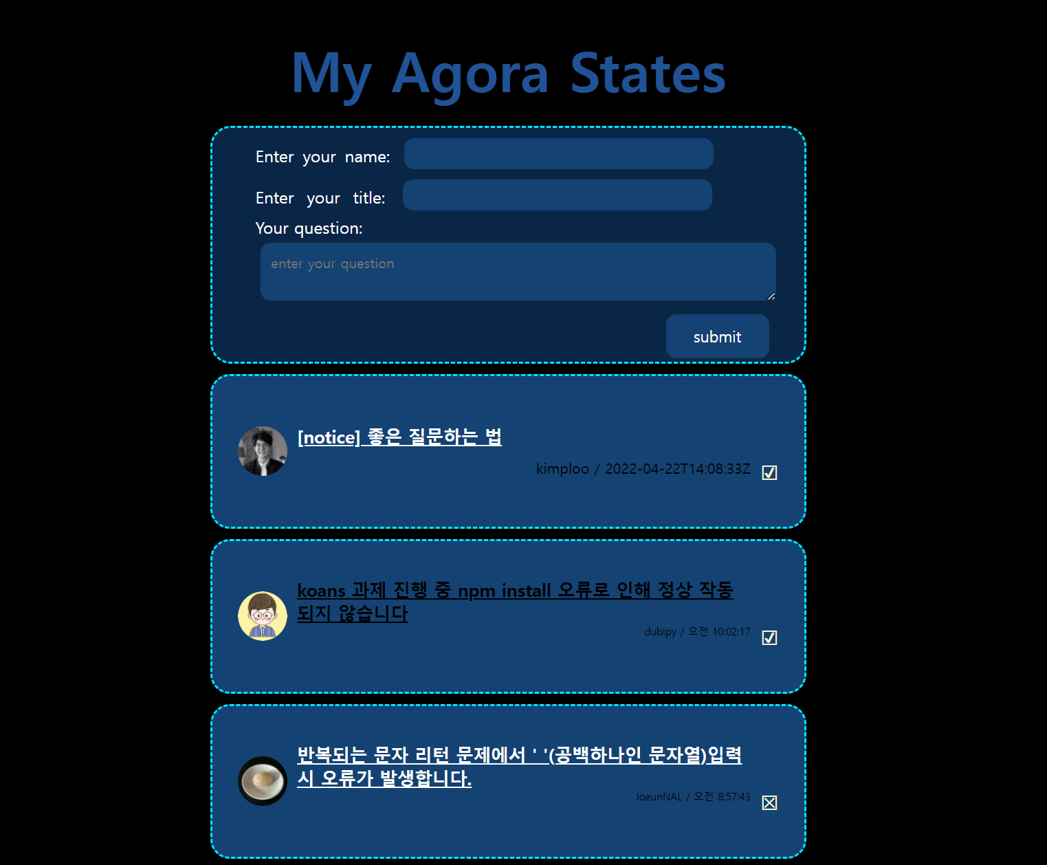 - section.form__container 요소에 새로운 아고라 스테이츠 질문을 추가할 수 있는 입력 폼을 제작합니다. 형식은 자유입니다.