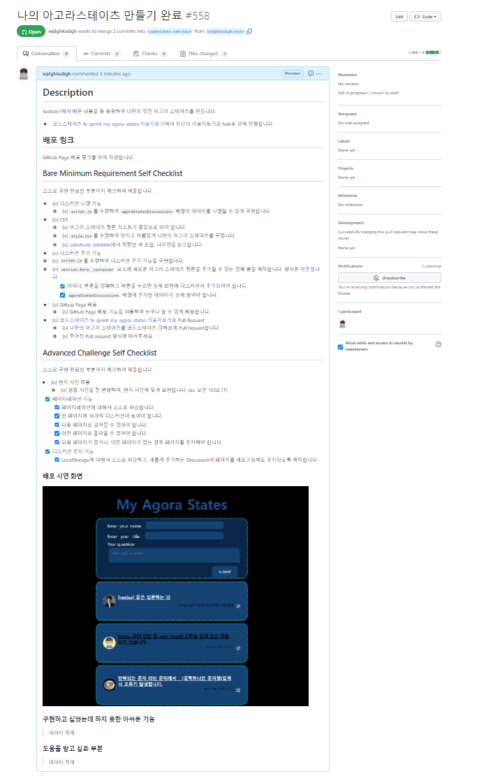// index.html을 열어서 agoraStatesDiscussions 배열 요소를 확인하세요. console.log(agoraStatesDiscussions); // convertToDiscussion은 아고라 스테이츠 데이터를 DOM으로 바꿔줍니다. const convertToDiscussion = (obj) => { const li = document.createElement("li"); // li 요소 생성 li.className = "discussion__container"; // 클래스 이름 지정 const avatarWrapper = document.createElement("div"); avatarWrapper.className = "discussion__avatar--wrapper"; const discussionContent = document.createElement("div"); discussionContent.className = "discussion__content"; const discussionAnswered = document.createElement("div"); discussionAnswered.className = "discussion__answered"; // TODO: 객체 하나에 담긴 정보를 DOM에 적절히 넣어주세요. // 프로필 사진 넣어주기 const face = document.createElement("img") // 프로필 사진 face.src = obj.avatarUrl; face.alt = "avatar of" + obj.author; //my error point face.className = "discussion__avatar--image"; avatarWrapper.append(face); // 스테이츠 속 질문 제목을 선언 url을 타고 깃허브로 간다 // h2로 선언된 변수가 질문 제목 const discussionTitle = document.createElement("h2"); // a로 선언된 변수가 질문 속 url const titleAnchor = document.createElement("a"); titleAnchor.href = obj.url; titleAnchor.textContent = obj.title; // 만든 질문 제목과 url을 적용 discussionTitle.append(titleAnchor); discussionContent.append(discussionTitle); // div로 선언된 질문 속 정보 선언 const discussionInfo = document.createElement("div"); // 저자가 누군지 문자열 리터럴로 선언 discussionInfo.textContent = `${obj.author} / ${new Date(obj.createdAt).toLocaleTimeString()}` // 질문 내용 적용 discussionContent.append(discussionTitle, discussionInfo); // 질문 속 체크박스 생성 // p 태그로 선언된 checked const checked = document.createElement("p"); // textcontent는 텍스트를 추가할 수 있는 프로퍼티 checked.textContent = obj.answer ? "☑︎" : "☒"; // checked 적용 discussionAnswered.append(checked); li.append(avatarWrapper, discussionContent, discussionAnswered); return li; }; // agoraStatesDiscussions 배열의 모든 데이터를 화면에 렌더링하는 함수입니다. const render = (element) => { for (let i = 0; i < agoraStatesDiscussions.length; i += 1) { element.append(convertToDiscussion(agoraStatesDiscussions[i])); } return; }; // ul 요소에 agoraStatesDiscussions 배열의 모든 데이터를 화면에 렌더링합니다. const ul = document.querySelector("ul.discussions__container"); render(ul); form.addEventListener("submit", (event) => { event.preventDefault(); //서브밋 이벤트로 사용시 꼭 함께 사용해주어야함 // addEventListener 안으로 선언 위치 이동 const author = form.querySelector("div.form__input--name > input").value; const title = form.querySelector("div.form__input--title > input").value; const textbox = form.querySelector("div.form__textbox > textarea").value; const Obj = { id: "new id", createdAt: new Date().toISOString(), title: title, url: "https://github.com/codestates-seb/agora-states-fe/discussions", author: author, bodyHTML: textbox, avatarUrl: "https://avatars.githubusercontent.com/u/97888923?s=64&u=12b18768cdeebcf358b70051283a3ef57be6a20f&v=4" } // addEventListener 안으로 선언 위치 이동 **agoraStatesDiscussions.unshift(newObj); const discussion = convertToDiscussion(newObj); ul.prepend(discussion); // submit 후 입력란 빈칸으로 리셋하는 기능 추가 form.querySelector("div.form__input--name > input").value = ""; form.querySelector("div.form__input--title > input").value = ""; form.querySelector("div.form__textbox > textarea").value = ""; } )배포 화면