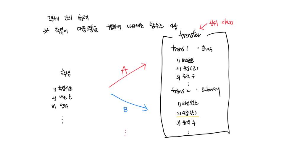 package cooperation; public class Student { String studentName; int grade; int money; public Student(String studentName,int money) { this.studentName = studentName; this.money = money; } public void takeBus(Bus bus) { bus.take(1000); money -= 1000; //핵심부분 협업이 이루어지는 부분!!! } public void takeSubway(Subway subway) { subway.take(1500); money -= 1000; //핵심부분 협업이 이루어지는 부분!!! } public void showInfo() { System.out.println(studentName + "님의 남은 돈은" + money + "입니다"); } }주석이 달린 저부분이 객체 간의 협력이 이루어 진 것을 알 수 있다!