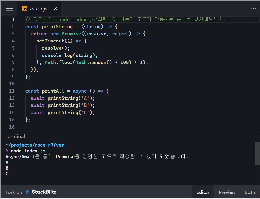 const printString = (string) => { return new Promise((resolve, reject) => { setTimeout(() => { resolve(string); }, Math.floor(Math.random() * 100) + 1); }); }; const printAll = () => { printString('A').then((value) => { console.log(value); printString('B').then((value) => { console.log(value);๐ช Async/Await (์ค์)