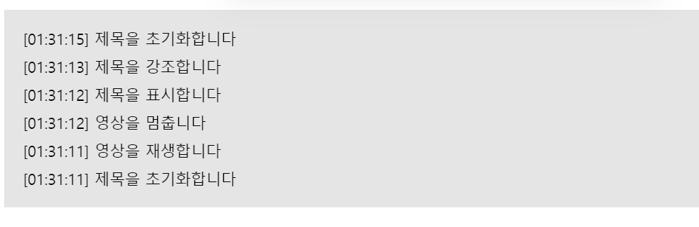 function runPromise() { resetTitle(); playVideo(); sleep(1000) .then((param) => { console.log(param); pauseVideo(); displayTitle(); return "world"; }) .then((param) => { console.log(param); return sleep(5000); }) .then(highlightTitle) .then(sleep.bind(null, 2000)) .then(resetTitle); }์คํ๊ฒฐ๊ณผ