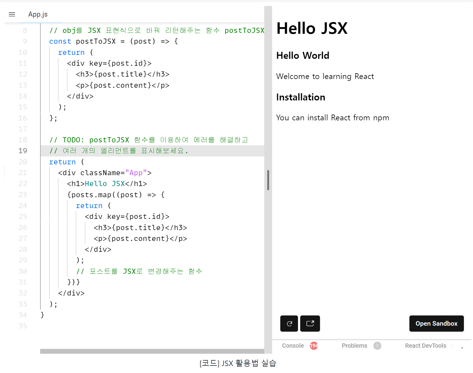 import React from "react"; import "./styles.css"; function App() { const user = { firstName: "React", lastName: "JSX Activity" }; function formatName(user) { return user.firstName + " " + user.lastName; } // ์ฃผ์์ ์์ ์ ์ค์ตํด๋ณด๊ธฐ // JSX ์์ด ํ์ฉํ React // return React.createElement("h1", null, `Hello, ${formatName(user)}!`); // JSX ๋ฅผ ํ์ฉํ React // return <h1>Hello, {formatName(user)}!</h1>; } export default App;๐ jsx ํ์ฉ