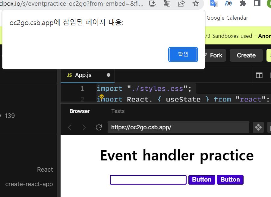 import "./styles.css"; import React, { useState } from "react"; function NameForm() { const [name, setName] = useState(""); const handleChange = (e) => { setName(e.target.value); }; const handleClick = () => { alert(name); }; return ( <div className="App"> <h1>Event handler practice</h1> <input type="text" value={name} onChange={handleChange}></input> <button onClick={handleClick}>Button</button> // ํจ์๋ฅผ ํธ์ถ(์ด ๋ฐฉ๋ฒ์ ๋ ์ ํธ) <button onClick={() => alert(name)}>Button</button> // ํจ์๋ฅผ ์ ์ธ ๋ฐ ํธ์ถ <h3>{name}</h3> </div> ); } export default NameForm;์คํ ๊ฒฐ๊ณผ ๋๊ฐ์ง ๋ฒํผ ๋ชจ๋ alert์ด ๋จ๋ ๊ฒ์ด ํ์ธ ๊ฐ๋ฅํ๋ค