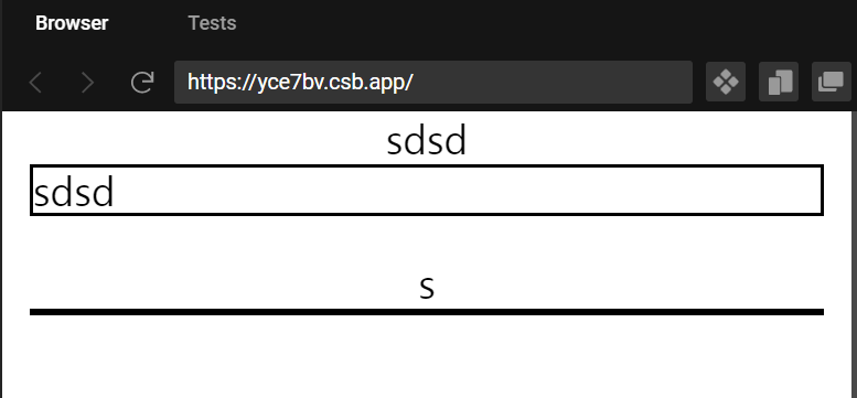 import "./styles.css"; import React, { useState } from "react"; export default function App() { const [username, setUsername] = useState(""); const [msg, setMsg] = useState(""); return ( <div className="App"> <div>{username}</div> <input type="text" value={username} onChange={(event) => setUsername(event.target.value)} // ์ปจํธ๋กค ์ปดํฌ๋ํธ placeholder="์ฌ๊ธฐ๋ ์ธํ์ ๋๋ค." className="tweetForm__input--username" ></input> <div>{msg}</div> {/* TODO : ์ input๊ณผ ๊ฐ์ด ์ ๋ ฅ์ ๋ฐ๋ผ์ msg state๊ฐ ๋ณํ ์ ์๊ฒ ์๋ textarea๋ฅผ ๋ณ๊ฒฝํ์ธ์. */} <textarea placeholder="์ฌ๊ธฐ๋ ํ ์คํธ ์์ญ์ ๋๋ค." className="tweetForm__input--message" onChange={(event) => setMsg(event.target.value)} value={""} ></textarea> </div> ); }์คํ ๊ฒฐ๊ณผ