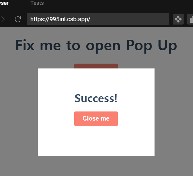 import React, { useState } from "react"; import "./styles.css"; function App() { const [showPopup, setShowPopup] = useState(false); const togglePopup = (e) => { // Pop up ์ open/close ์ํ์ ๋ฐ๋ผ // ํ์ฌ state ๊ฐ ์ ๋ฐ์ดํธ ๋๋๋ก ํจ์๋ฅผ ์์ฑํ์ธ์. if (showPopup === false) { setShowPopup(true); } else setShowPopup(false); }; return ( <div className="App"> <h1>Fix me to open Pop Up</h1> {/* ๋ฒํผ์ ํด๋ฆญํ์ ๋ Pop up ์ open/close ๊ฐ ์๋ํ๋๋ก button tag๋ฅผ ์์ฑํ์ธ์. */} <button className="open" onClick={togglePopup}> Open me </button> {showPopup ? ( <div className="popup"> <div className="popup_inner"> <h2>Success!</h2> <button className="close" onClick={togglePopup}> Close me </button> </div> </div> ) : null} </div> ); } export default App;์คํ๊ฒฐ๊ณผ