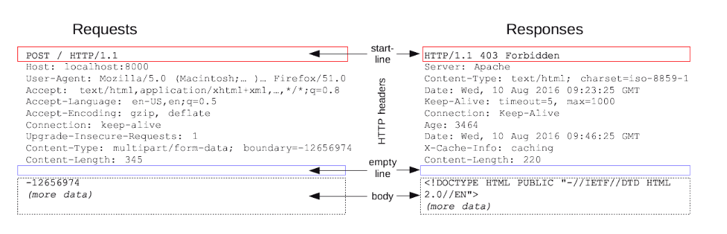 body : ์์ฒญ๊ณผ ๊ด๋ จ๋ ๋ฐ์ดํฐ๋ ์๋ต๊ณผ ๊ด๋ จ๋ ๋ฐ์ดํฐ ๋๋ ๋ฌธ์๋ฅผ ํฌํจ ์์ฒญ๊ณผ ์๋ต์ ์ ํ์ ๋ฐ๋ผ ์ ํ์ ์ผ๋ก ์ฌ์ฉํ๋ค์ด ์ค start line๊ณผ HTTP headers๋ฅผ ๋ฌถ์ด ์์ฒญ์ด๋ ์๋ต์ ํค๋(head)๋ผ๊ณ ํ๊ณ , payload๋ body๋ผ๊ณ ํ๋ค.