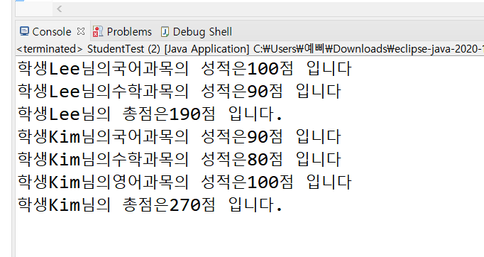 package array; public class StudentTest { public static void main(String[] args) { Student studentLee = new Student(1001, "Lee"); studentLee.addSubject("국어",100); studentLee.addSubject("수학",90); studentLee.showStudentInfo(); Student studentKim = new Student(1002, "Kim"); studentKim.addSubject("국어",90); studentKim.addSubject("수학",80); studentKim.addSubject("영어",100); studentKim.showStudentInfo(); } }프로그래밍
