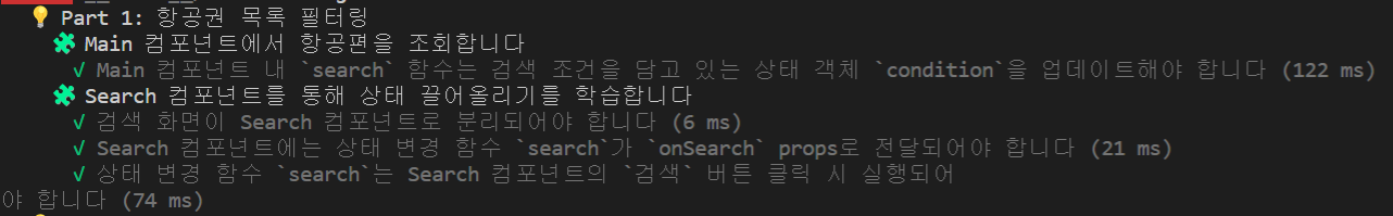 const search = ({ departure, destination }) => { if ( condition.departure !== departure || condition.destination !== destination ) { console.log('condition ์ํ๋ฅผ ๋ณ๊ฒฝ์ํต๋๋ค'); // TODO: search ํจ์๊ฐ ์ ๋ฌ ๋ฐ์์จ 'ํญ๊ณตํธ ๊ฒ์ ์กฐ๊ฑด' ์ธ์๋ฅผ condition ์ํ์ ์ ์ ํ๊ฒ ๋ด์๋ณด์ธ์. setCondition({departure, destination}) } };- Search ์ปดํฌ๋ํธ์๋ ์ํ ๋ณ๊ฒฝ ํจ์ search๊ฐ onSearch props๋ก ์ ๋ฌ๋์ด์ผ ํฉ๋๋ค
