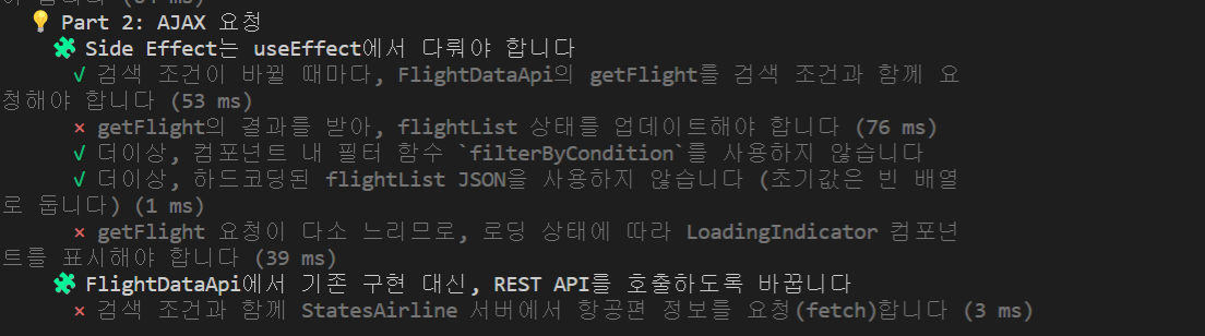 // TODO: Effeck Hook์ ์ด์ฉํด AJAX ์์ฒญ์ ๋ณด๋ด๋ณด์ธ์. // TODO: ๋๋ถ์ด, ๋คํธ์ํฌ ์์ฒญ์ด ์งํ๋จ์ ๋ณด์ฌ์ฃผ๋ ๋ก๋ฉ ์ปดํฌ๋ํธ(<LoadingIndicator/>)๋ฅผ ์ ๊ณตํด๋ณด์ธ์. const [isLoading, setIsLoading] = useState(false) // useEffect(() => { useEffect(() => { getFlight(condition) }, [condition] )<Search onSearch={search}/> <div className="table"> <div className="row-header"> <div className="col">์ถ๋ฐ</div> <div className="col">๋์ฐฉ</div> <div className="col">์ถ๋ฐ ์๊ฐ</div> <div className="col">๋์ฐฉ ์๊ฐ</div> <div className="col"></div> </div> //์ด์ api๋ฅผ ์ด์ฉํด์ list๋ฅผ ๋ฐ์ ๊ฒ์ด๊ธฐ ๋๋ฌธ์ filterByCondition๋ ์ฃผ์ ์ฒ๋ฆฌ ํด์ค๋ค {/* <FlightList list={flightList.filter(filterByCondition)} /> */} // ๋ก๋ฉ์ค์ด๋ฉด LoadingIndicator ์ปดํฌ๋ํธ, ๋ก๋ฉ์ค์ด ์๋๋ฉด flightList ์ปดํฌ๋ํธ ์ถ๋ ฅ {isLoading ? <LoadingIndicator /> : <FlightList list ={flightList } /> } </div>๋ก๋ฉํ๋ฉด์ด ๋์๊ฐ์ ์๋๋ก useEffect์ ์ถ๊ฐ ๊ตฌํ