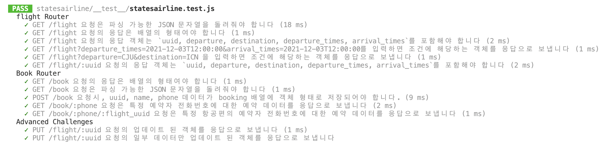 const express = require('express'); const cors = require('cors'); const app = express(); // ๋ชจ๋ ์๋ฒ๋ ์์ฒญ์ ๋ฐ์์ ์๋ ํฌํธ ๋ฒํธ๋ฅผ ํ์๋ก ํฉ๋๋ค. // HTTP server์ ํ์ค ํฌํธ๋ ๋ณดํต 80 ๋ฒ ์ด์ง๋ง, ๋ณดํต ๋ค๋ฅธ ์๋ฒ์์ ์ฌ์ฉ์ค์ด๊ธฐ ๋๋ฌธ์ ์ ๊ทผํ ์ ์์ต๋๋ค. // ๋ฐ๋ผ์ ์ฐ๋ฆฌ๋ ๋ณดํต ํ ์คํธ ์๋ฒ ํฌํธ๋ก 3000, 8080, 1337 ๋ฑ์ ํ์ฉํฉ๋๋ค. // PORT๋ ์ํํธ์ ํธ์์๋ ๊ฐ์ต๋๋ค. ์๋ฒ๋ก ์์ฒญ์ ๋ฐ๊ธฐ ์ํด์๋ ๋ค์๊ณผ ๊ฐ์ด ํฌํธ ๋ฒํธ๋ฅผ ์ค์ ํฉ๋๋ค. // (* ๋์ ๋ฐ๋ผ ๋ค๋ฅธ ํฌํธ๋ฒํธ๋ฅผ ์ด๊ณ ์ถ๋ค๋ฉด, ํ๊ฒฝ ๋ณ์๋ฅผ ํ์ฉ ํ๊ธฐ๋ ํฉ๋๋ค.) const port = 3001; const flightRouter = require('./router/flightRouter'); const bookRouter = require('./router/bookRouter'); const airportRouter = require('./router/airportRouter'); app.use(cors()); app.use(express.json()); app.use('/flight', flightRouter); app.use('/book', bookRouter); app.use('/airport', airportRouter); app.get('/', (req, res) => { res.status(200).send('Welcome, States Airline!'); }); app.use((req, res, next) => { res.status(404).send('Not Found!'); }); app.use((err, req, res, next) => { console.error(err.stack); res.status(500).send({ message: 'Internal Server Error', stacktrace: err.toString() }); }); app.listen(port, () => { console.log(`[RUN] StatesAirline Server... | http://localhost:${port}`); }); module.exports = app;2. '์ฃผ์/'๋ฅผ ๋ค์ด๊ฐ๋ฉด ๋ผ์ฐํธ ์คํ
