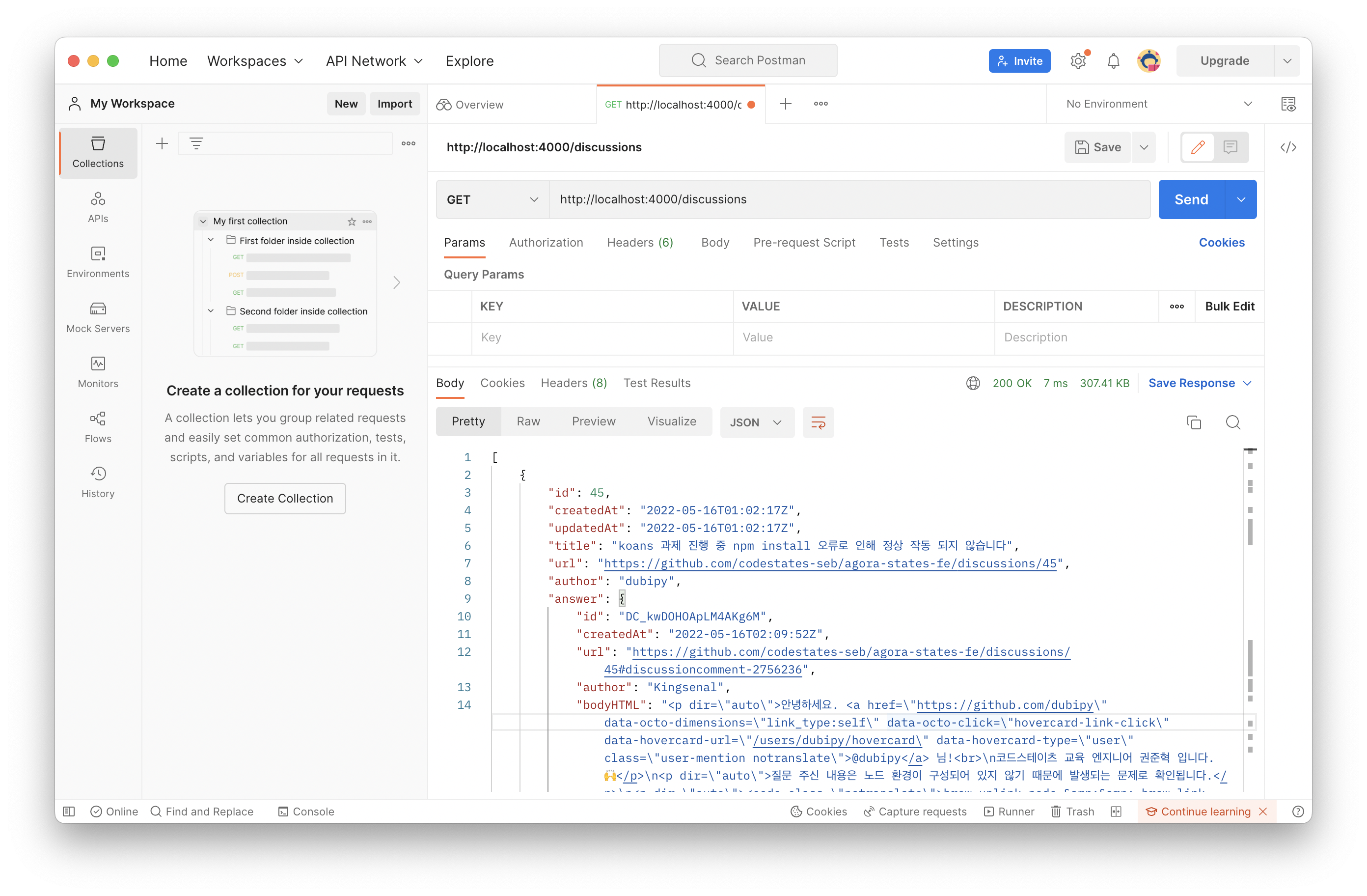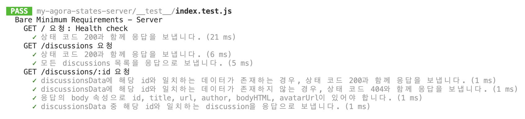const express = require('express'); const app = express(); const cors = require('cors'); const morgan = require('morgan'); // morgan ๋ฏธ๋ค์จ์ด๊ฐ ์ธํ ๋์ด ์์ต๋๋ค. // HTTP ์์ฒญ logger๋ฅผ ํธ๋ฆฌํ๊ฒ ์ฌ์ฉํ ์ ์๋ ๋ฏธ๋ค์จ์ด ์ ๋๋ค. app.use(morgan('tiny')); // TODO: cors๋ฅผ ์ ์ฉํฉ๋๋ค. app.use(cors()); // TODO: Express ๋ด์ฅ ๋ฏธ๋ค์จ์ด์ธ express.json()์ ์ ์ฉํฉ๋๋ค. app.use(express.json()); const port = 4000; const discussionsRouter = require('./router/discussions'); // TODO: app.use()๋ฅผ ํ์ฉํ์ฌ /discussions ๊ฒฝ๋ก๋ก ๋ผ์ฐํ ํฉ๋๋ค. app.use('/discussions',discussionsRouter); app.get('/', (req, res) => { // ์๋ฒ ์ํ ํ์ธ์ ์ํด ์ํ ์ฝ๋ 200๊ณผ ํจ๊ป ์๋ต์ ๋ณด๋ ๋๋ค. res.status(200).send('fe-sprint-my-agora-states-server'); }); const server = app.listen(port, () => { console.log(`[RUN] My Agora States Server... | http://localhost:${port}`); }); module.exports.app = app; module.exports.server = server;2. '์ฃผ์/'๋ฅผ ๋ค์ด๊ฐ๋ฉด ๋ผ์ฐํธ ์คํ