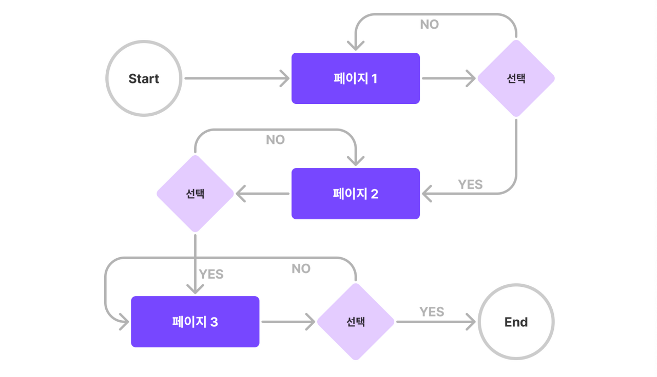 사용자 흐름(User Flose)은 사용자가 제품에 진입한 시점을 시작으로 취할 수 있는 모든 행동을 뜻하며, 보통 아래 이미지처럼 다이어그램을 그려서 정리한다.