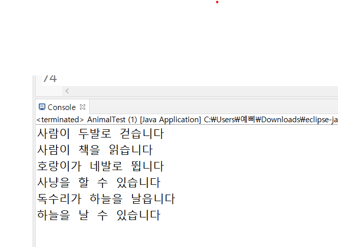 한 클래스 안에 동물테스트를 같이 구현하여 실행값을 알아본다