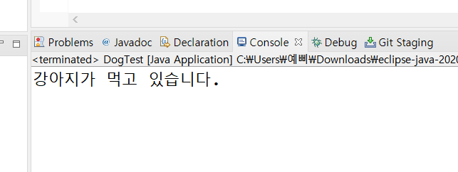 package inheitance; public class DogTest { public static void main(String[] args) { Dog dog = new Dog(); dog.eat(); } }실행결과