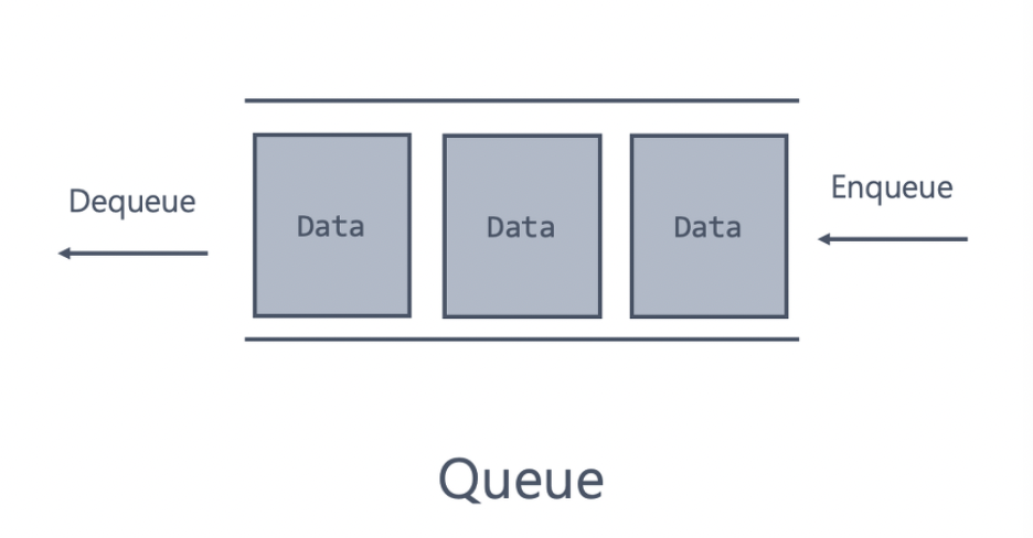 예1) 1, 2, 3, 4를 큐에 차례대로 넣습니다. queue.enqueue(데이터) 출력 방향(head) <---------------------------< 입력 방향(tail) 1 <- 2 <- 3 <- 4 <---------------------------< 들어간 순서대로, 1번이 제일 먼저 들어가고 4번이 마지막으로 들어가게 됩니다. 예2) 큐가 빌 때까지 데이터를 전부 빼냅니다. queue.dequeue(데이터) 출력 방향(head) <---------------------------< 입력 방향(tail) <---------------------------< 1, 2, 3, 4 제일 첫 번째 있는 데이터부터 차례대로 나오게 됩니다.2. 두 개의 입출력 방향을 가지고 있습니다.