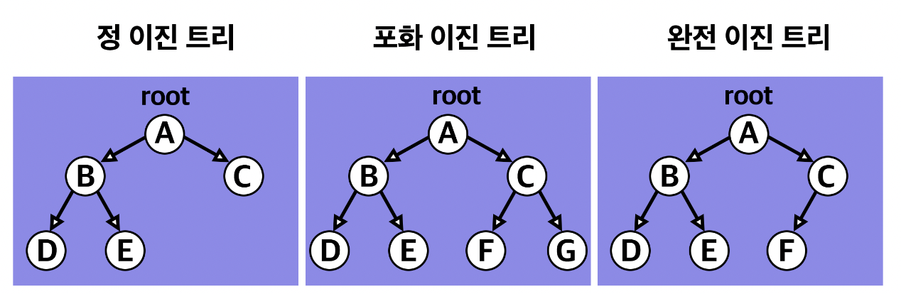 자료의 삽입, 삭제 방법에 따라 정 이진 트리, 포화 이진 트리, 완전 이진 트리로 나눈다.