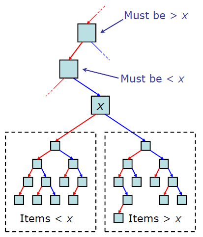 - 각 노드의 오른쪽 서브트리에는 해당 노드의 값보다 큰 값을 지닌 노드들로 이루어져 있다.