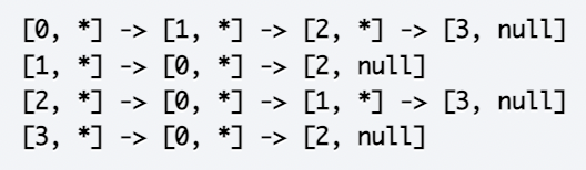0번 노드는 1, 2, 3과 모두 이어져 있으므로 [0, *] -> [1, *] -> [2, *] -> [3, null]