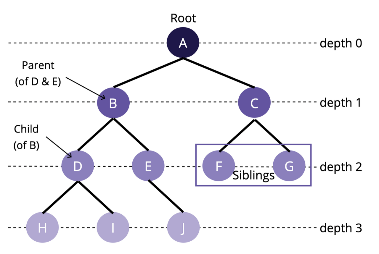 - 깊이 (depth) : 루트로부터 하위 계층의 특정 노드까지의 깊이(루트노드의 깊이는 0이다.)
