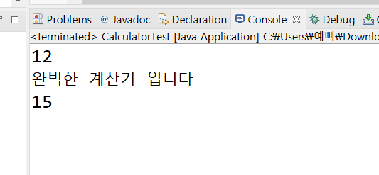 package interfaceEx; public class CalculatorTest { public static void main(String[] args) { int num1 =10; int num2 = 2; Calc calc = new CompleteCalc(); //타입의 선언된 메서드들만 호출할 수 있다. System.out.println(calc.add(num1, num2)); calc.description(); int[] arr = {1,2,3,4,5}; int sum = Calc.total(arr); System.out.println(sum); } }실행결과