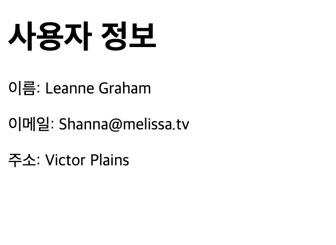 <!DOCTYPE html> <html lang="en"> <head> <meta charset="UTF-8" /> <meta name="viewport" content="width=device-width, initial-scale=1.0" /> <title>Why Typescript?</title> </head> <body> <h1>์ฌ์ฉ์ ์ ๋ณด</h1> <div> <p>์ด๋ฆ: <span id="username"></span></p> <p>์ด๋ฉ์ผ: <span id="email"></span></p> <p>์ฃผ์: <span id="address"></span></p> </div> <script src="https://unpkg.com/axios/dist/axios.min.js"></script> <script src="./app.js"></script> </body> </html>์คํ๊ฒฐ๊ณผ