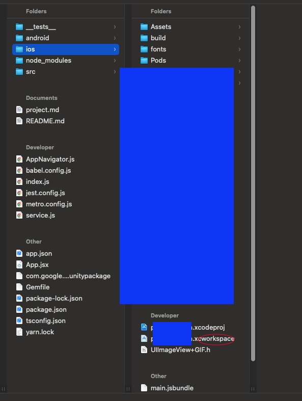 원하는 폴더에 들어간 후 -> ios 클릭 -> 해당폴더명.xcworkspace를 클릭하면 xcode가 실행된다.