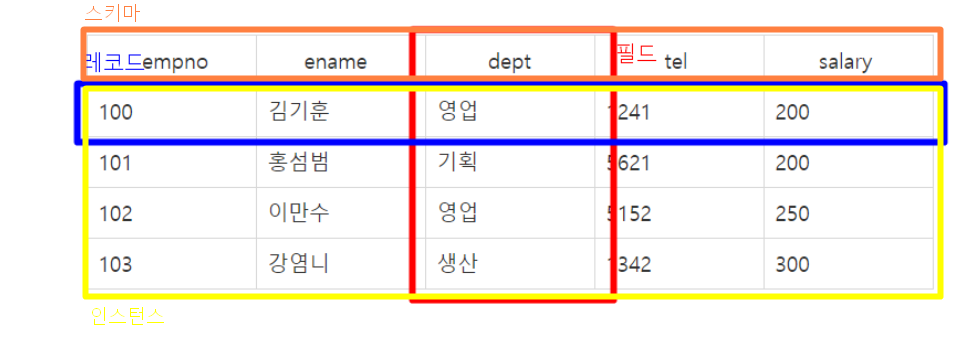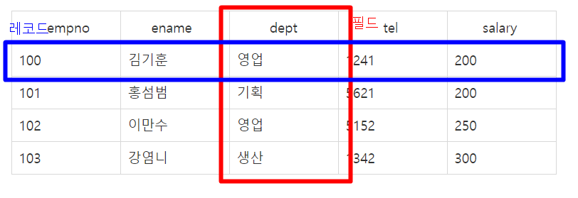 세로줄 : 필드(속성,열,애트리뷰트)