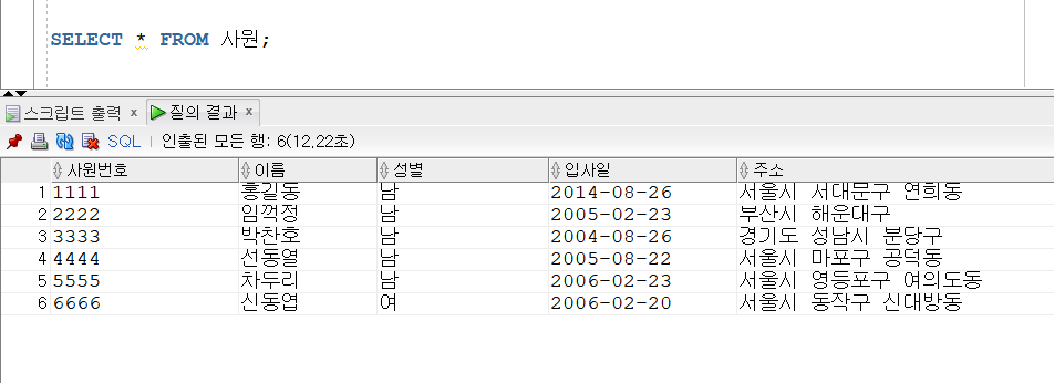 사원(사원번호,이름,성별,입사일,주소,부서코드)