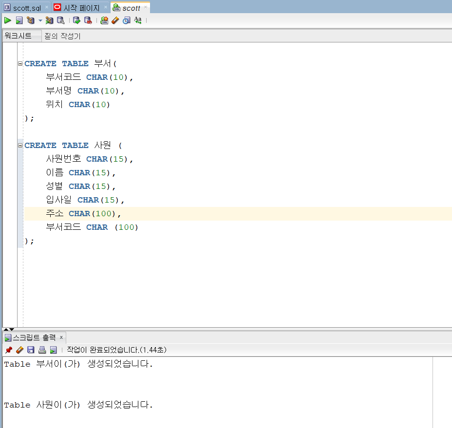 1.부서.사원 테이블 만들기