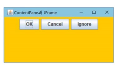 package project5; import java.awt.Color; import java.awt.Container; import java.awt.FlowLayout; import javax.swing.JButton; import javax.swing.JFrame; import javax.swing.JLabel; public class ContentPaneEx extends JFrame { public ContentPaneEx() { this.setTitle("ContentPane 과 JFrame"); this.setDefaultCloseOperation(JFrame.EXIT_ON_CLOSE); Container contentPane = this.getContentPane(); contentPane.setBackground(Color.ORANGE); contentPane.setLayout(new FlowLayout()); contentPane.add(new JButton("OK")); contentPane.add(new JButton("Cancel")); contentPane.add(new JButton("Ignore")); JLabel la = new JLabel("동양미래대학교"); contentPane.add(la); contentPane.add(new JLabel("HelloWorld~")); this.setSize(300, 150); this.setVisible(true); } public static void main(String[] args) { new ContentPaneEx(); } }실행결과