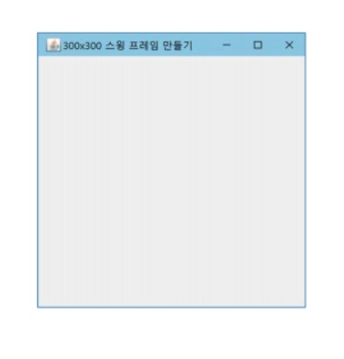package project5; import javax.swing.JFrame; public class MyFrame extends JFrame { MyFrame(){ setTitle("300x300 스윙 프레임 만들기"); setSize(300,300); //프레임 크기 300x300 setVisible(true); //프레임 출력 } public static void main(String[] args) { MyFrame mf = new MyFrame(); } }출력결과