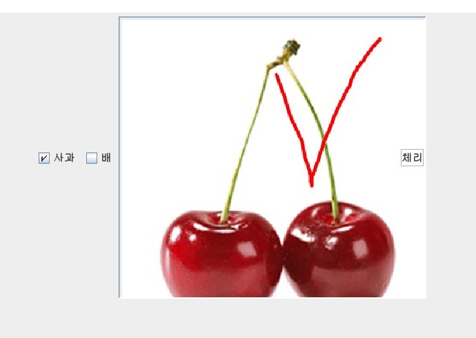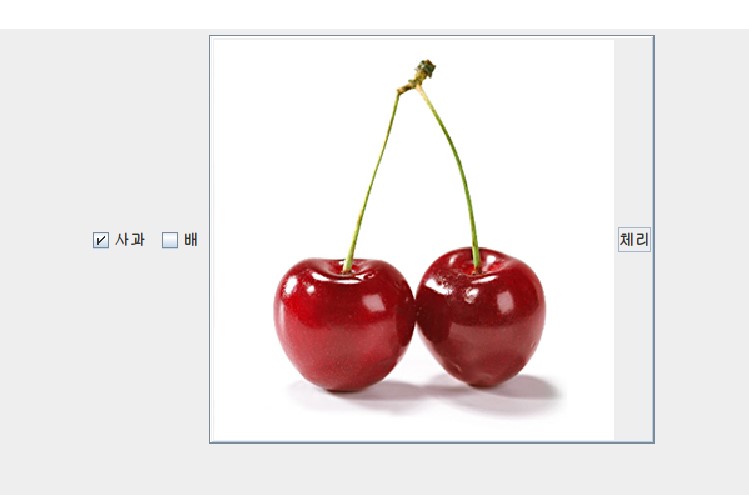 ImageIcon cherryIcon = new ImageIcon("imeges/cherry.jpg"); ImageIcon selectedCherryIcon = new ImageIcon("imeges/selectedCherry.jpg"); JCheckBox cherry = new JCheckBox("체리",cherryIcon); cherry.setSelectedIcon(selectedCherryIcon); //선택 상태의 이미지 달기체크박스 생성 예제