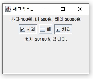 JCheckBox c = new JCheckBox("사과");"배" 텍스트를 가지고 선택 상태로 체크박스 생성
