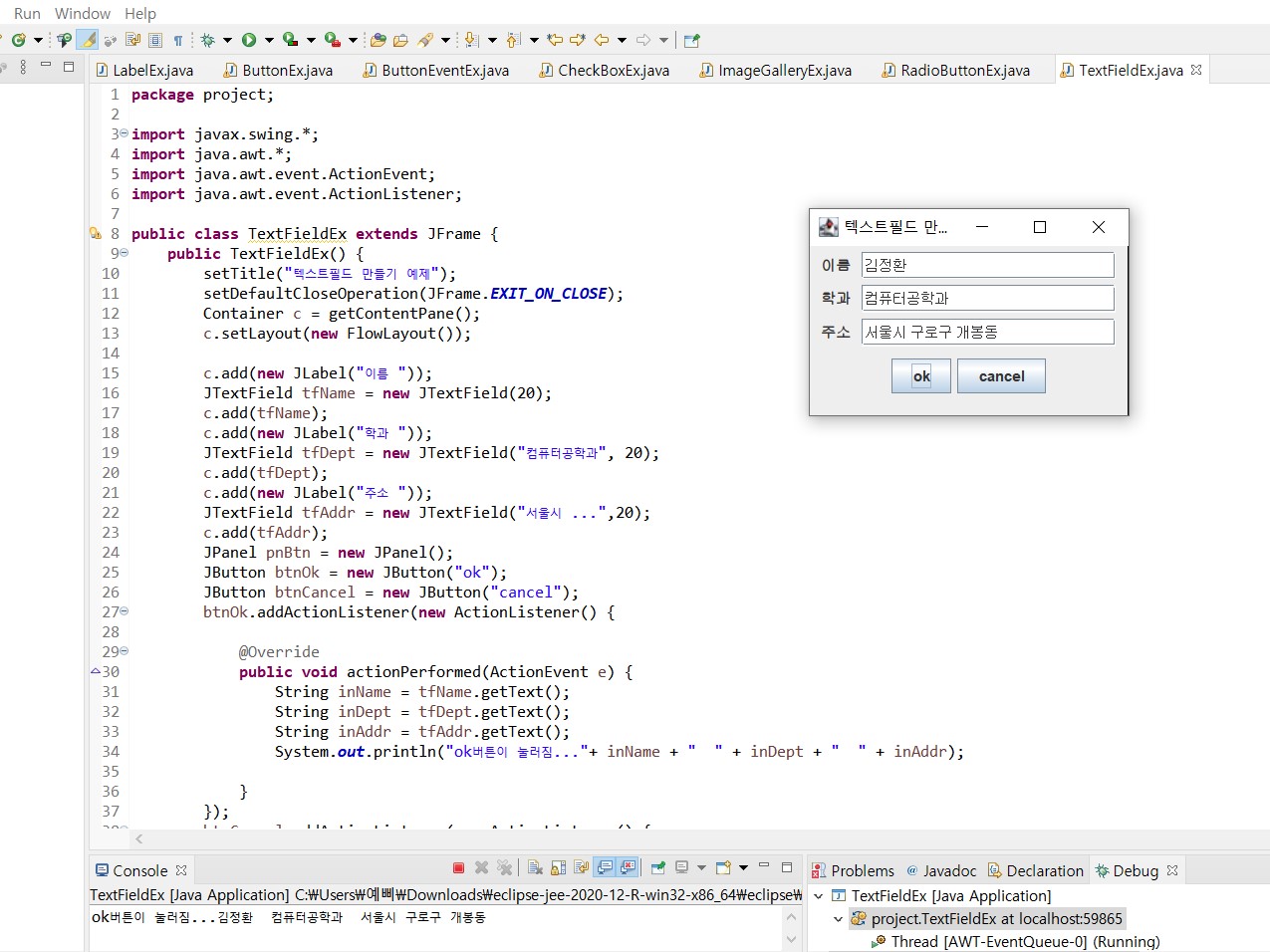 package project; import javax.swing.*; import java.awt.*; import java.awt.event.ActionEvent; import java.awt.event.ActionListener; public class TextFieldEx extends JFrame { public TextFieldEx() { setTitle("텍스트필드 만들기 예제"); setDefaultCloseOperation(JFrame.EXIT_ON_CLOSE); Container c = getContentPane(); c.setLayout(new FlowLayout()); c.add(new JLabel("이름 ")); JTextField tfName = new JTextField(20); c.add(tfName); c.add(new JLabel("학과 ")); JTextField tfDept = new JTextField("컴퓨터공학과", 20); c.add(tfDept); c.add(new JLabel("주소 ")); JTextField tfAddr = new JTextField("서울시 ...",20); c.add(tfAddr); JPanel pnBtn = new JPanel(); JButton btnOk = new JButton("ok"); JButton btnCancel = new JButton("cancel"); btnOk.addActionListener(new ActionListener() { @Override public void actionPerformed(ActionEvent e) { String inName = tfName.getText(); String inDept = tfDept.getText(); String inAddr = tfAddr.getText(); System.out.println("ok버튼이 눌러짐..."+ inName + " " + inDept + " " + inAddr); } }); btnCancel.addActionListener(new ActionListener() { @Override public void actionPerformed(ActionEvent e) { tfName.setText("");tfDept.setText(""); tfAddr.setText(""); } }); pnBtn.add(btnOk); pnBtn.add(btnCancel); c.add(pnBtn); setSize(300,150); setVisible(true); } public static void main(String [] args) { new TextFieldEx(); } }실행결과