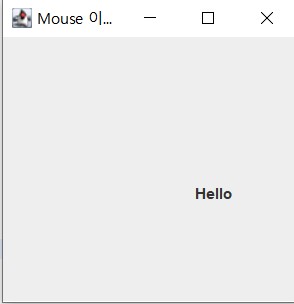 package project; import javax.swing.*; import java.awt.event.*; import java.awt.*; public class MouseListenerEx extends JFrame { private JLabel la = new JLabel("Hello"); public MouseListenerEx() { setTitle("Mouse 이벤트 예제"); setDefaultCloseOperation(JFrame.EXIT_ON_CLOSE); Container c = getContentPane(); c.setLayout(null); JLabel la = new JLabel("Hello"); la.setSize(50, 20); la.setLocation(30, 30); c.add(la); c.addMouseListener( new MouseListener() { public void mousePressed(MouseEvent e) { int x = e.getX(); int y = e.getY(); la.setLocation(x, y); } public void mouseReleased(MouseEvent e) {} public void mouseClicked(MouseEvent e) {} public void mouseEntered(MouseEvent e) {} public void mouseExited(MouseEvent e) {} }); setSize(250, 250); setVisible(true); } public static void main(String [] args) { new MouseListenerEx(); } }