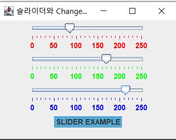 void stateChanged(ChangeEvent e) 컴포넌트의 상태가 변할 때 호출되며 changeEvent 객체를 인자로 전달받는다예제)JSlider와 Change이벤트를 활용한 색깔 다루기