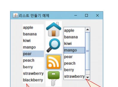 JList<String> scrollList = new JList<String>(fruits); new JScrollPane(scrollList);예제) 리스트 만들기
