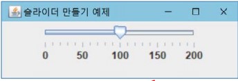 import javax.swing.*; import java.awt.*; public class SliderEx extends JFrame { public SliderEx() { setTitle("슬라이더 만들기 예제"); setDefaultCloseOperation(JFrame.EXIT_ON_CLOSE); Container c = getContentPane(); c.setLayout(new FlowLayout()); JSlider slider = new JSlider(JSlider.HORIZONTAL, 0, 200, 100); slider.setPaintLabels(true); slider.setPaintTicks(true); slider.setPaintTrack(true); slider.setMajorTickSpacing(50); slider.setMinorTickSpacing(10); c.add(slider); setSize(300,100); setVisible(true); } public static void main(String [] args) { new SliderEx(); } }실행결과)