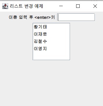 package project; import javax.swing.*; import java.awt.event.*; import java.util.*; import java.awt.*; public class ListChangeEx extends JFrame { private JTextField tf = new JTextField(10); private Vector<String> v = new Vector<String>(); private JList<String> nameList = new JList<String>(v); public ListChangeEx() { setTitle("리스트 변경 예제"); setDefaultCloseOperation(JFrame.EXIT_ON_CLOSE); Container c = getContentPane(); c.setLayout(new FlowLayout()); c.add(new JLabel("이름 입력 후 <enter>키")); c.add(tf); v.add("황기태"); v.add("이재문"); nameList.setVisibleRowCount(5); nameList.setFixedCellWidth(100); c.add(new JScrollPane(nameList)); setSize(300,300); setVisible(true); tf.addActionListener(new ActionListener() { @Override public void actionPerformed(ActionEvent e) { JTextField t = (JTextField)e.getSource(); v.add(t.getText()); t.setText(""); nameList.setListData(v); } }); } public static void main(String [] args) { new ListChangeEx(); } }실행결과)