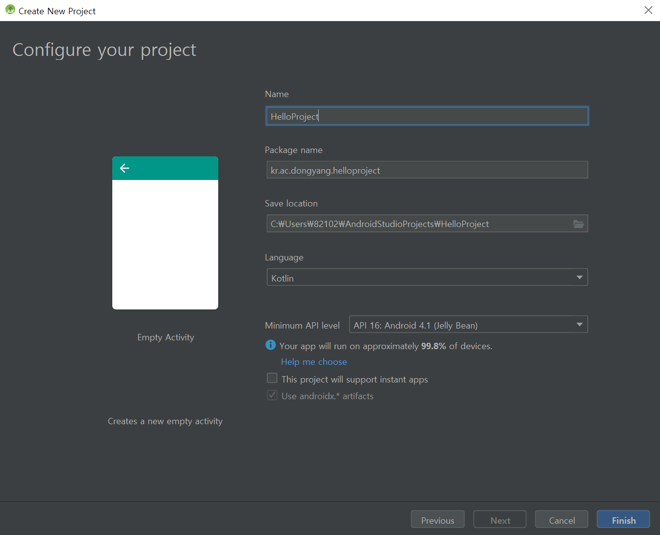 본인이 만들고 싶은 project명 을 입력하여 finish