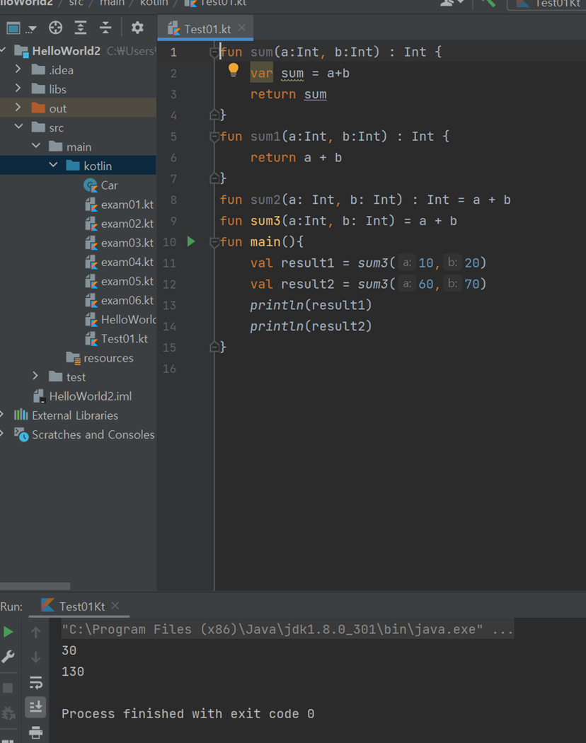 var myVar : Int = 100 // 전역변수 fun main() { var myVar : Int = 0 println (myVar) var sum : Int = addFunction(10,20) println(sum) } fun addFunction(num1: Int, num2:Int) : Int { var hap : Int // 지역변수 hap = num1 + num2 + myVar return hap }출력결과