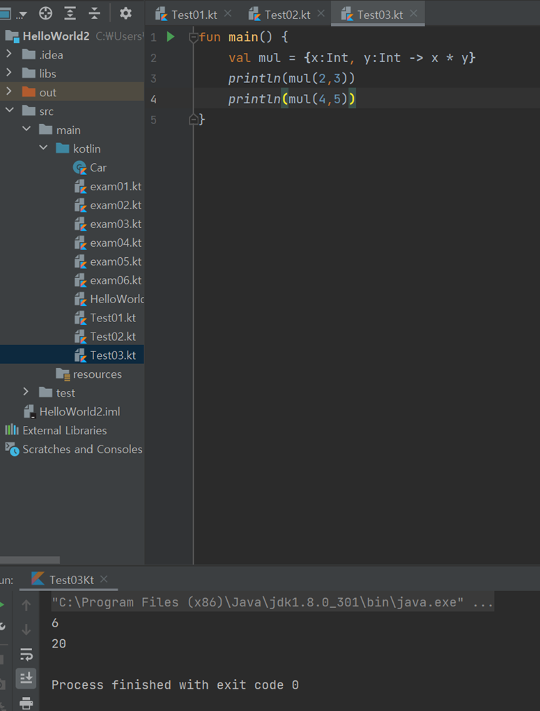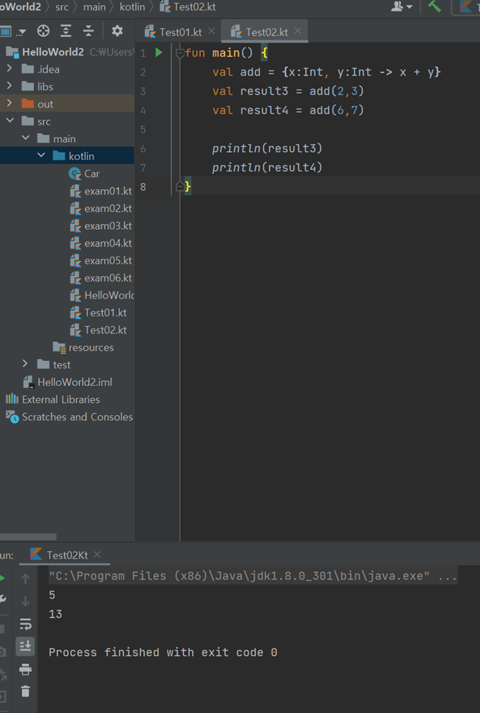 fun main() { val2 greeting2 = {name: String, age:Int -> "Hello. my name is $name. I am $age year old"} val result2 = greeting2("dongyang",20) print(result2) }출력결과