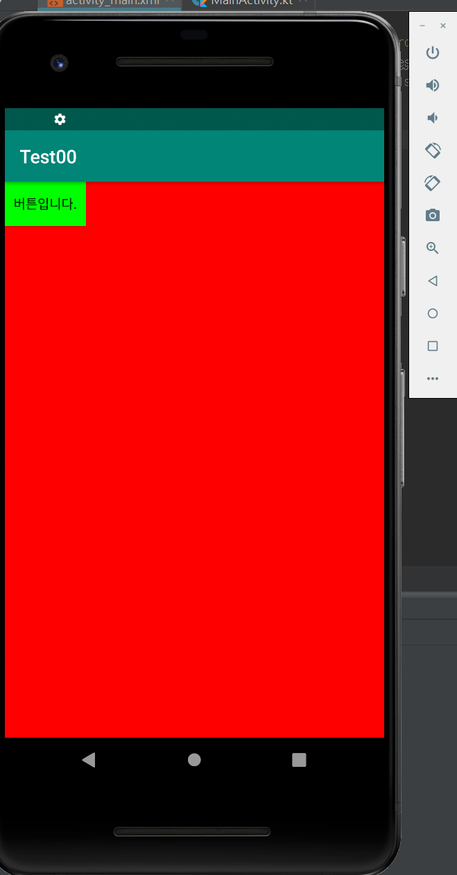 <?xml version="1.0" encoding="utf-8"?> <LinearLayout xmlns:android="http://schemas.android.com/apk/res/android" xmlns:app="http://schemas.android.com/apk/res-auto" xmlns:tools="http://schemas.android.com/tools" android:layout_width="match_parent" android:layout_height="match_parent" android:background="#ff0000" // check tools:context=".MainActivity"> <Button android:id="@+id/Btn1" android:layout_width="wrap_content" android:layout_height="wrap_content" android:background="#00ff00" //check android:text="버튼입니다." /> </LinearLayout>실행결과